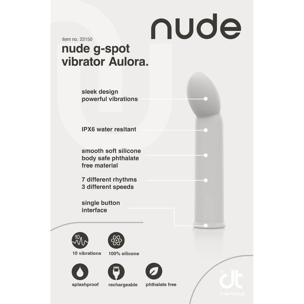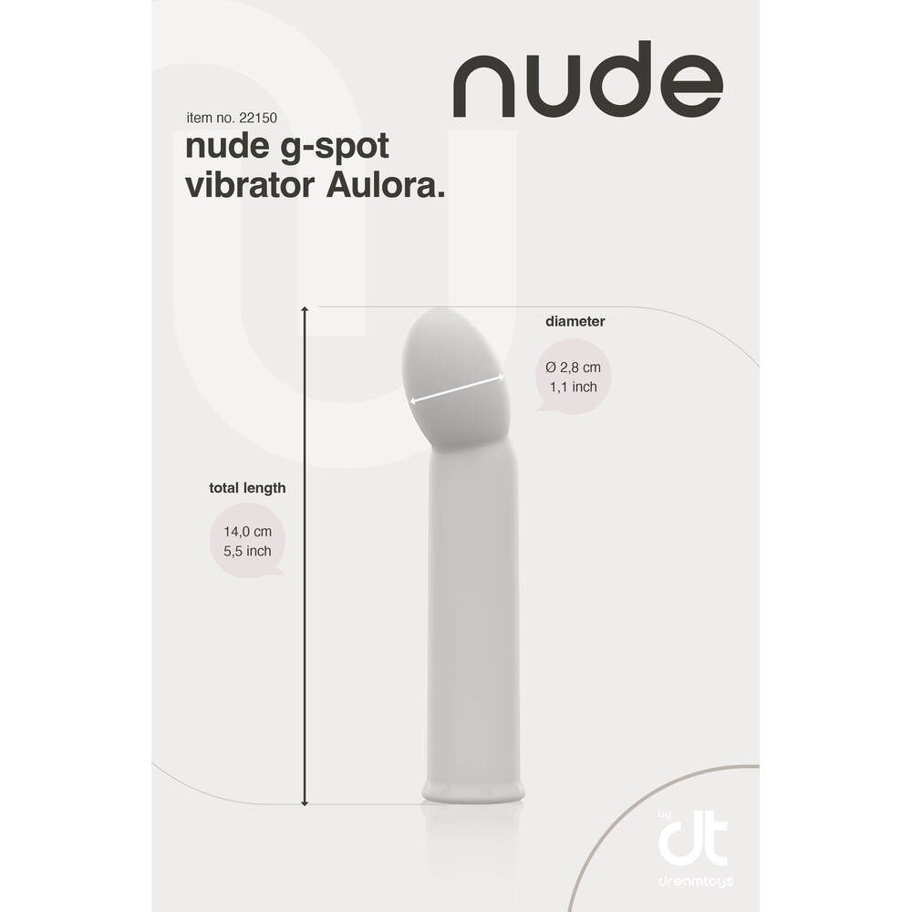 At Nude, we believe in the power of purity and quality. That's why every one of our products is meticulously crafted to provide you with an experience that's as natural as possible. Say goodbye to anything less than extraordinary and unlock the true essence of pleasure with our clean and refined toys.Experience the pleasure revolution that's sweeping the world the Nude revolution. Our products are more than just toys; they're gateways to euphoria and liberation. Let's get naked and unleash your most audacious fantasies with Nude's premium range of sensual delights. It's time to redefine pleasure, the Nude way.For ease of use, this travel-sized G-spot Vibrator Aulora by Nude has a single-button operation to cycle through the 10 strong vibrations. It has 7 rhythms and 3 speeds. The shape and size make it perfect for beginners and for anyone who likes subtle and tantalizing G-spot stimulation. The Nude vibrator is made of smooth soft silicone and ABS, free of phthalates and body safe. Aulora has an IPX6 rating for water resistance. For charging after use the vibrator has a waterproof charging hole. A USB pin cable is included. After a full charge, your Nude vibe is ready for 90 minutes of nudelicous delight.Let's get naked and discover the world of Nudelicious ecstasy!Nude Aulora Travel G-spot vibrator7 Vibration rhythms, 3 speedsSingle button operationMade of silicone and ABSBody safe, free of phthalatesIPX 6 water resistanceToy bag includedRechargeable, waterproof charging holeUSB-pin cable includedLength 14,1 cmDiameter 3 cm