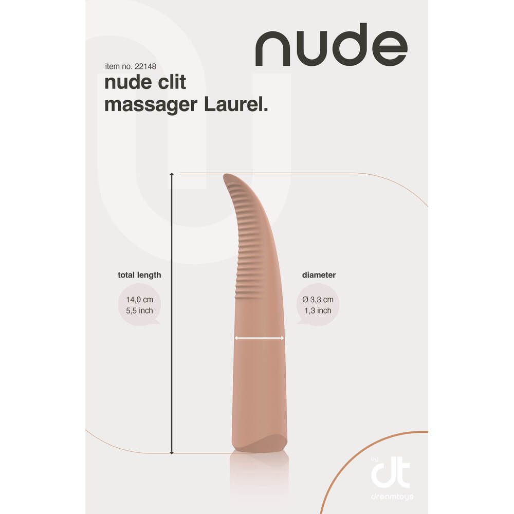 At Nude, we believe in the power of purity and quality. That's why every one of our products is meticulously crafted to provide you with an experience that's as natural as it gets. Say goodbye to anything less than extraordinary and unlock the true essence of pleasure with our clean and refined toys.Experience the pleasure revolution that's sweeping the world the Nude revolution. Our products are more than just toys; they're gateways to euphoria and liberation. Let's get naked and unleash your most audacious fantasies with Nude's premium range of sensual delights. It's time to redefine pleasure, the Nude way.This travel-sized Massager by Nude has single button operation to cycle through the 10 strong vibrations. It has 7 rhythms and 3 speeds. The flexible tip and stimulating ridges make this massager perfect for beginners and for anyone who likes subtle and tantalizing stimulation. The Nude massager Laurel is made of smooth soft silicone and ABS, free of phthalates and body safe. Laurel has an IPX6 rating for water resistance. For charging after use the vibrator has a waterproof charging hole. A USB pin cable is included. After a full charge, your Nude vibe is ready for 90 minutes of nudelicous delight.Let's get naked and discover the world of Nudelicious ecstasy!Nude Laurel Travel Massager7 Vibration rhythms, 3 speedsSingle button operationMade of silicone and ABSBody safe, free of phthalatesIPX 6 water resistanceToy bag includedRechargeable, waterproof charging holeUSB-pin cable includedLength 15,5 cmDiameter 2,9 cm